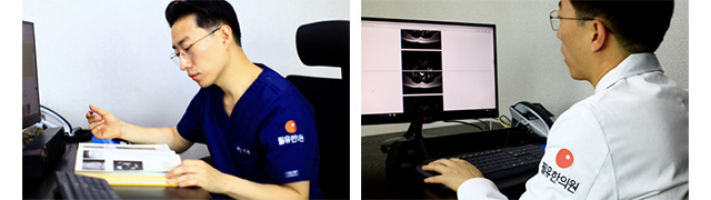 타병원의 MRI 자료 분석과 함께 오랜 진료노하우를 기반으로, 통증의 위치, 연관부위, 통증양상, 지속시간, 발병시의 상황, 소실상태(안정) 및 증감상태, 더욱 심해지는 시간, 역학적 긴장에 의한 통증 여부, 과거력, 직업, 가족력, 기타질병의 유무, 소화, 대소변 등에 대해 환자마다 핵심적인 문진을 진행합니다.